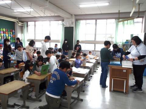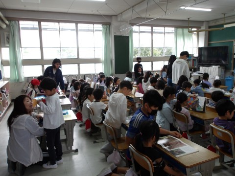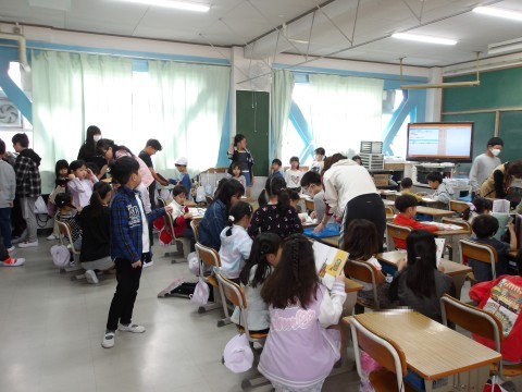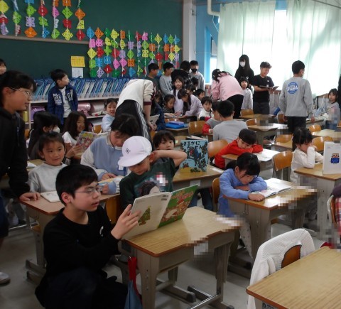 6年生が,朝の用意のお手伝いをしてくれています。用意ができた人は,読み聞かせをしてもらっています。