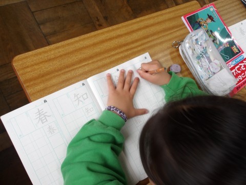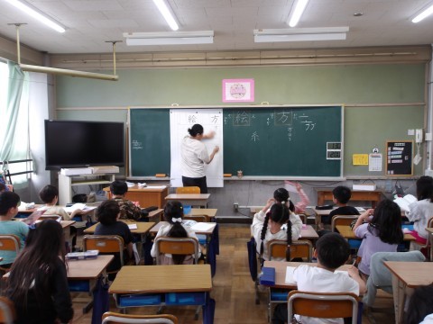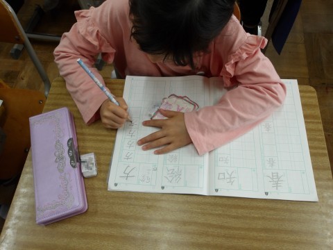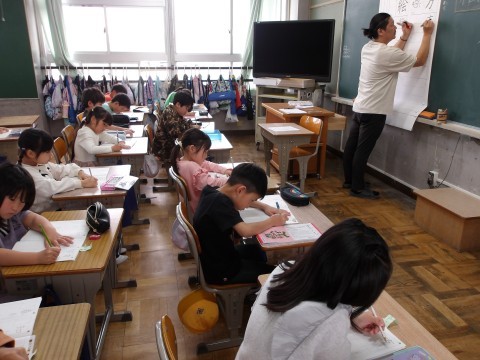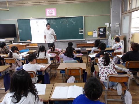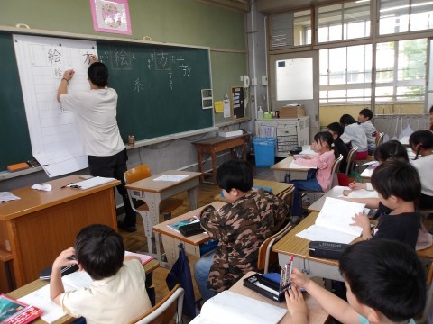 漢字ノートの使い方について,先生が丁寧に説明しながら漢字の学習をしています。