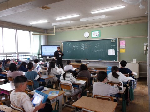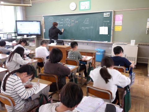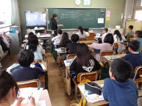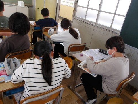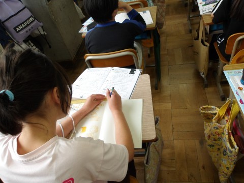 算数の復習をしています。ドリルを使って,誰と学ぶか,どこでするのか,自分で選択して進めます。