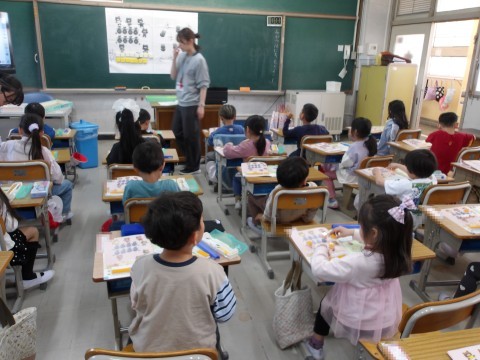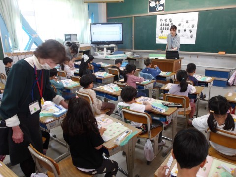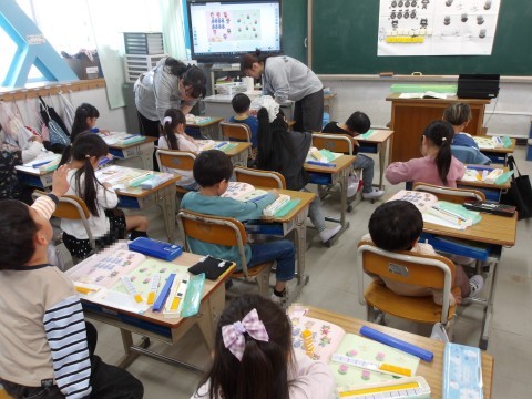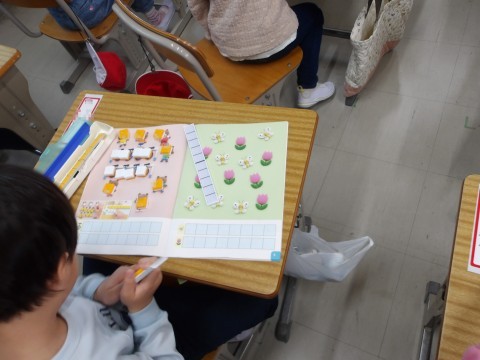 算数の学習をしています。算数ブロックを使って,数を数えています。