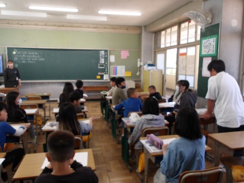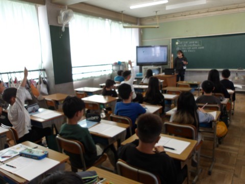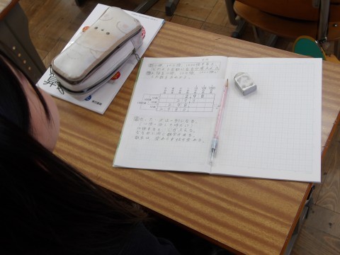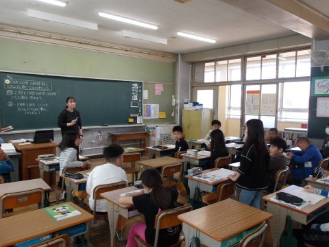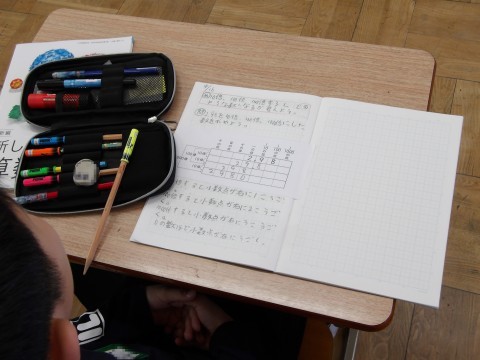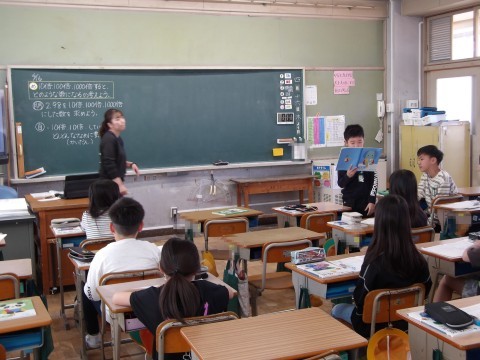 算数では,「10倍,100倍,1000倍すると,どんな数になるか」について考えています。「位が斜めに動いていく」「階段みたいになる」「10倍になると小数点が1つ右に移動する。100倍にすると小数点が1つ右に移動する。」と,気づいたことを言語化して発表しています。