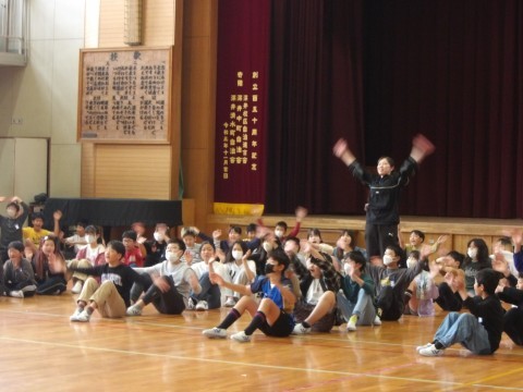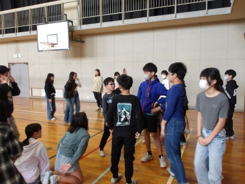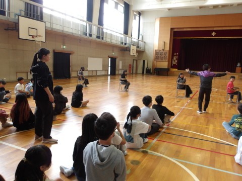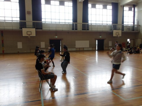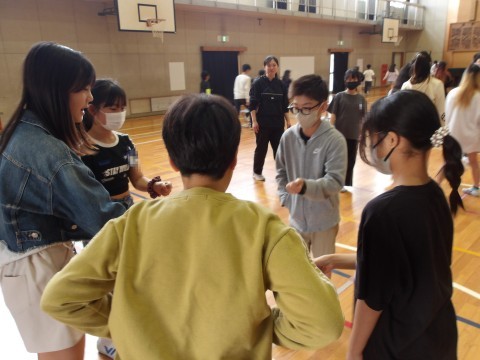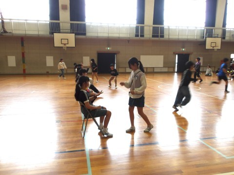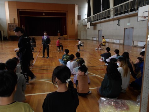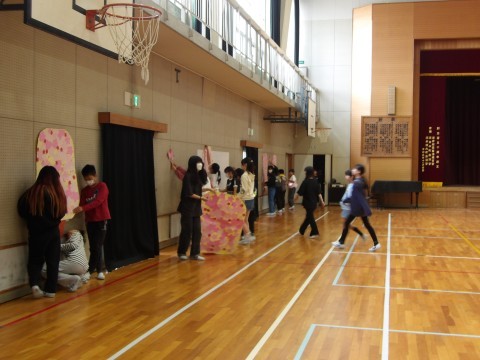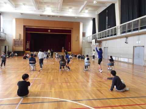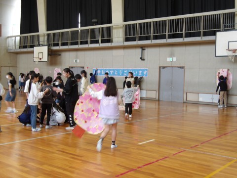 1年生のお迎え式の後かたずけをしてくれています。そのあと,学年でレクリエーション「じゃんけん突破レース」をして盛り上がっています。