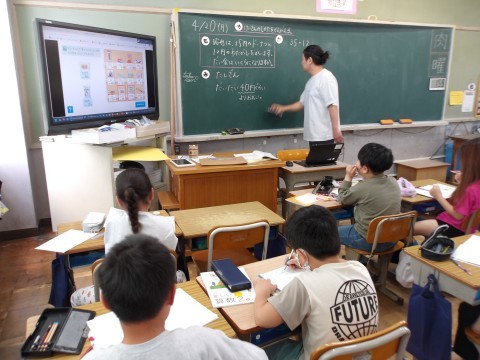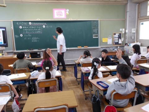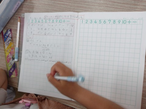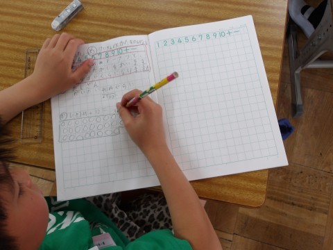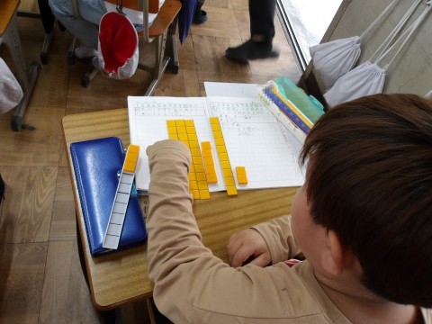 算数では,たし算の計算の仕方について,学習しています。図で表したり,算数ブロックを使ったりして,考えています。