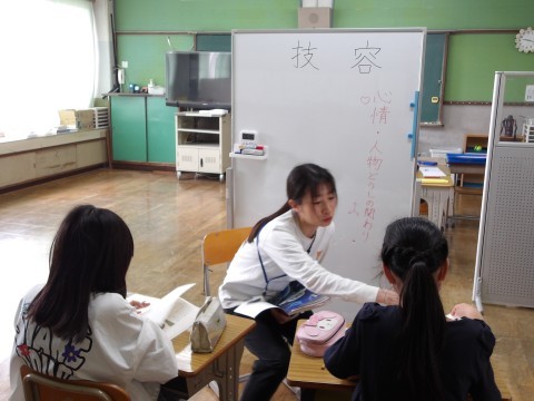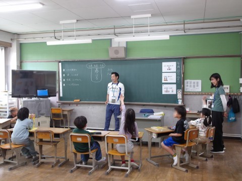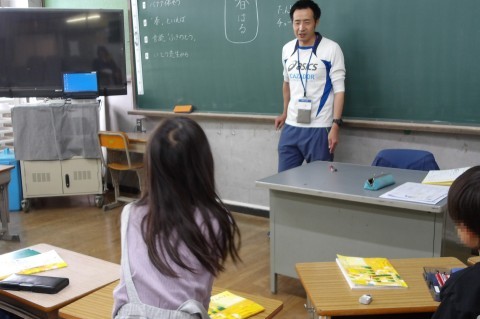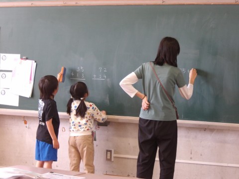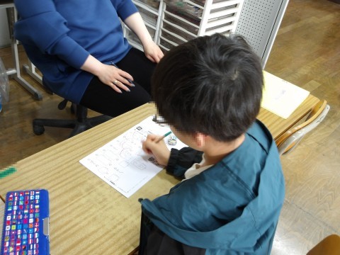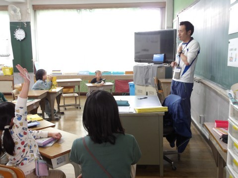 先生と一緒に,学習をしています。手を挙げて,たくさん発表することができています。