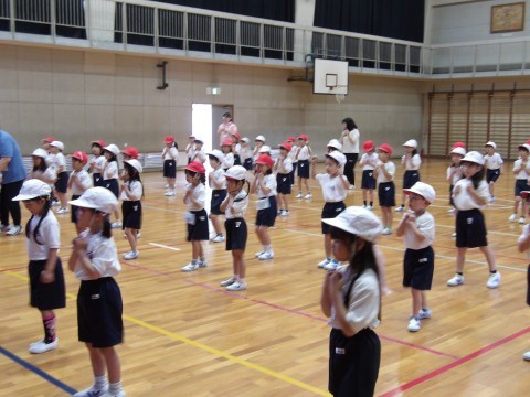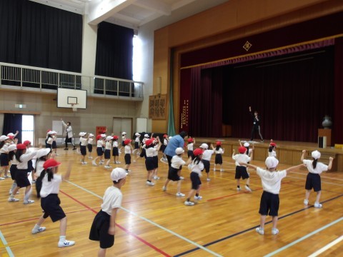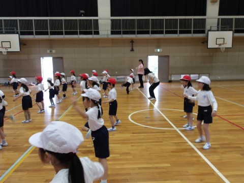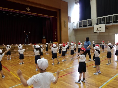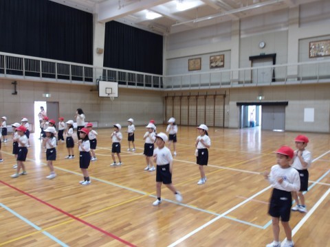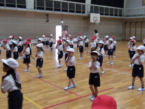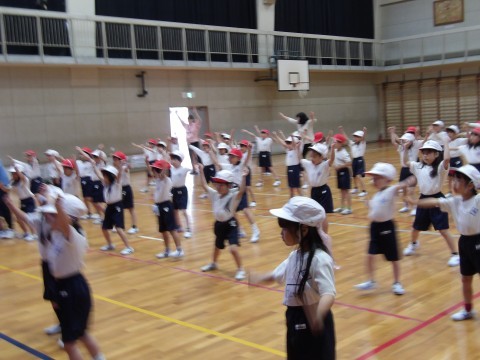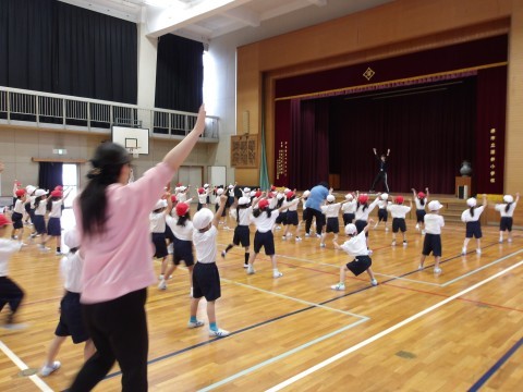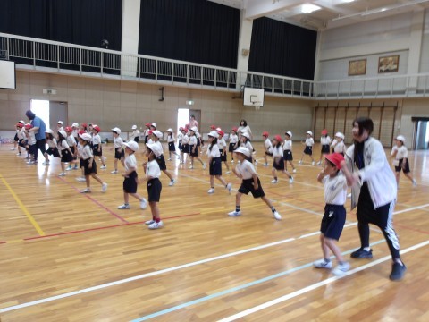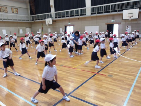 体育大会の団体演技の練習が始まっています。元気いっぱい楽しく体を動かしています。