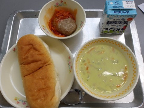 今日の献立「グリーンポタージュ」に使われているグリーンピースは,春から夏にかけてたくさんとれる“えんどう豆”のことです。春らしい色と風味を楽しんでみよう。