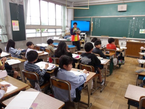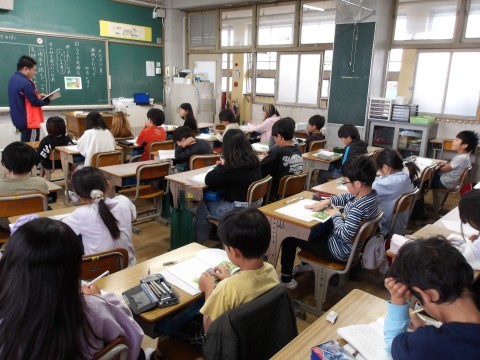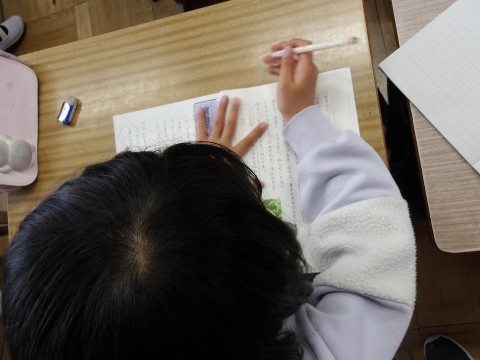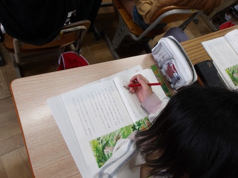 国語「春風をたどって」では,第2場面を読んで,ルウの気持ちの変化を読み取ります。先生の音読を聞きながら,ルウのきもちの変化や言ったこと,したこと,場面の様子が変わったところに線を引いています。その後,友だちと共有します。