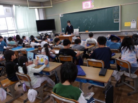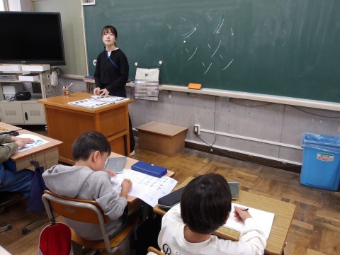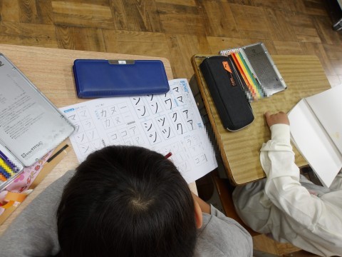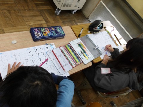 書写のカタカナの学習では,画の方向に気を付けながら練習をします。課題が終わった人は,挿し絵に色を塗ったり,本を読んだりしています。