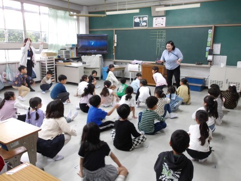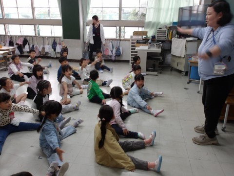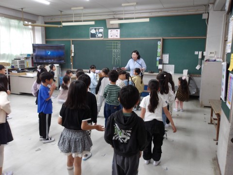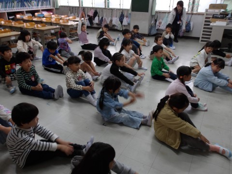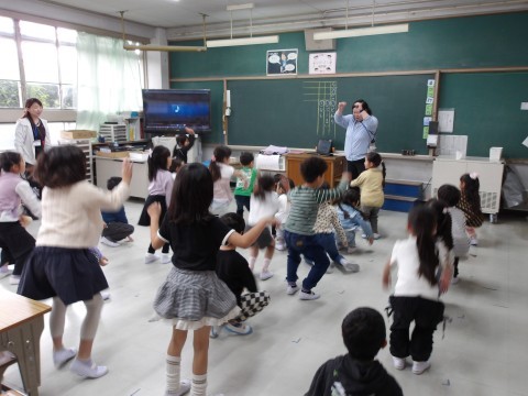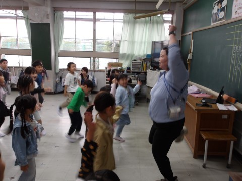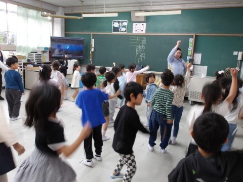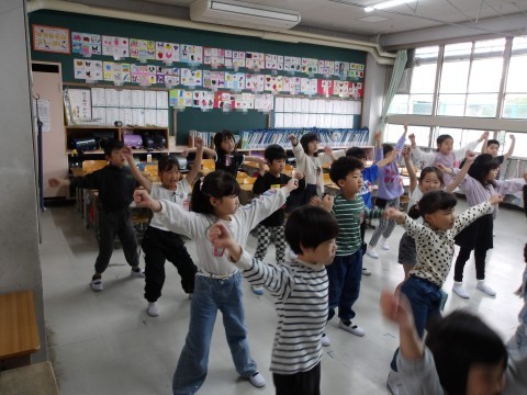 体育大会の団体演技の動きを確認しています。よく覚えていて,感心します。楽しそうですね。