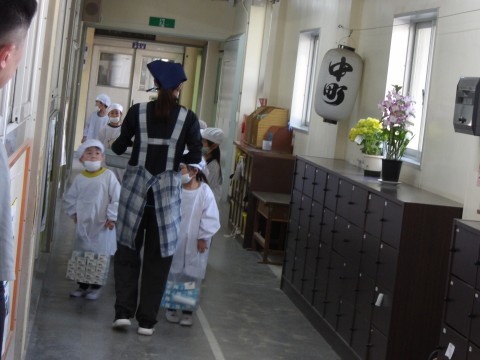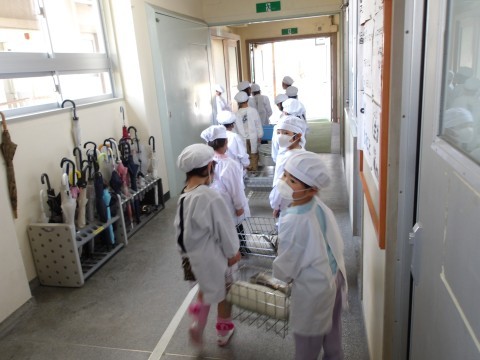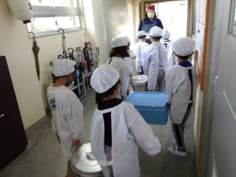 1年生は,自分たちの力だけで,給食場に食缶を取りに行けるようになりました。まだまだ,慣れていない様子で危なっかしいですが,他の学年と廊下ですれ違う時には,道を譲ってもらいながらゆっくりと慎重に運んでいます。がんばっていますね。