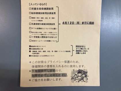 2点お願いがあります。来週月曜日までが,保健関係の書類やホームページの掲載の許可書等の提出日となっております。お忙しいとは思いますが,月曜日にお子様に持たせていただくよう,よろしくお願いします。