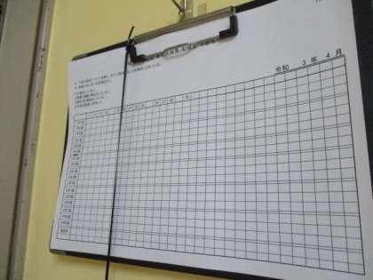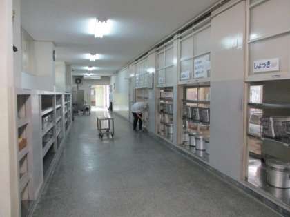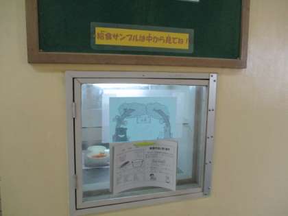 今年度初給食でした。給食場では入室時のチェック表や,給食の見本が置かれています。