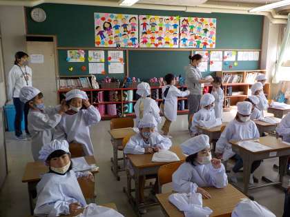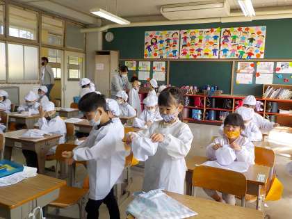 今日から小学校ではじめての給食を食べることになります。準備がスムーズにいくようにエプロンの着かたや給食場にいくときの並び方を確認しました。