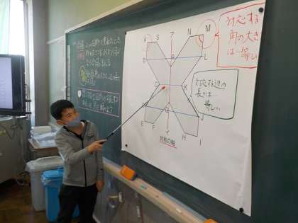 対称な図形の学習をしました。図形の中の対称の軸を見て,どんな特徴があるのかに気付いた子どもが,友達にヒントを出すなど,友だち同士で交流することができました。