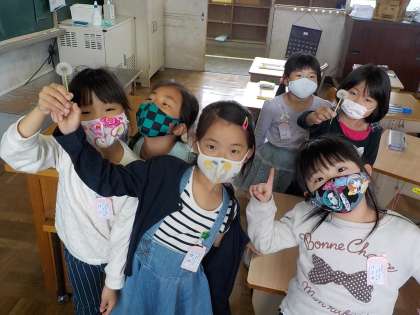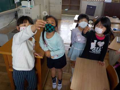 休み時間にたんぽぽのわた毛を見つけて見せてくれました☆みんなで,ふいていました♪春見つけができました。
