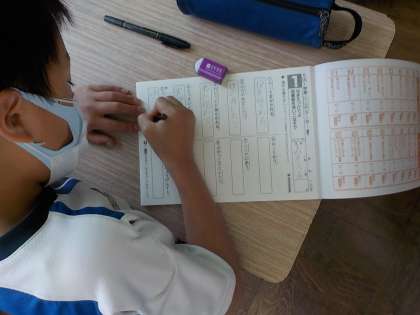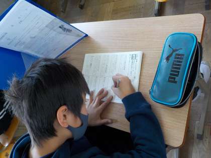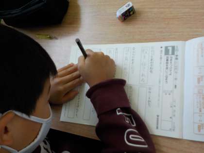 定着を確かめる漢字の小テストをしました。とめ・はね・はらいに気をつけて書いています。