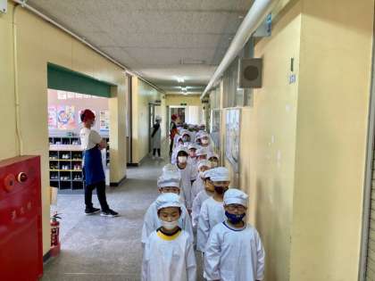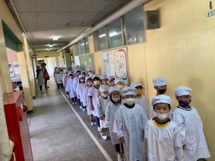 3組・1組・2組の順に並んでいます。廊下を静かに歩き,給食場の前でも静かに,ビシッと並んでいます!スーパー1年生です。素晴らしいです!