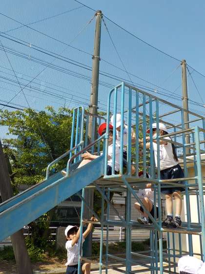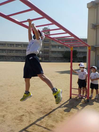 運動場にある遊具の使い方を聞き,みんなでうんていやのぼり棒に挑戦しました。