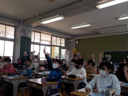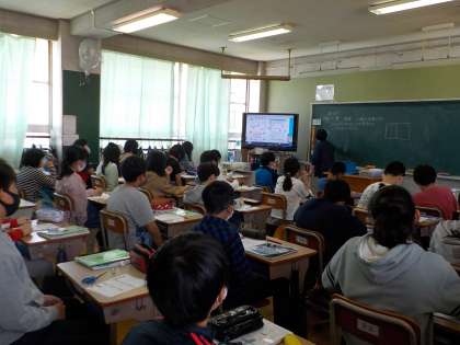 教室で映像を見ながら学習を進めています。
