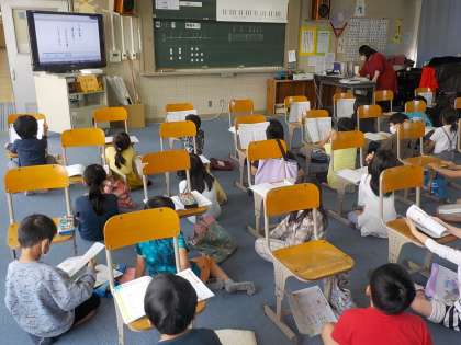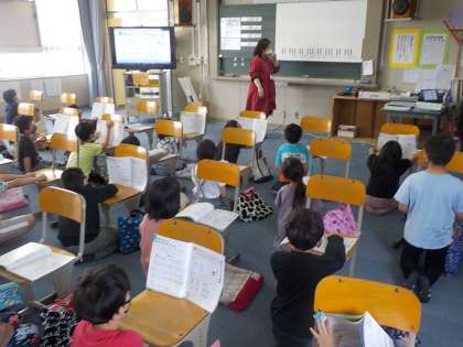 音楽の学習で,今日学習するメロディーを興味津々で聞いていました。音楽室に行く前は5分前行動を意識して早めに用意もしています。