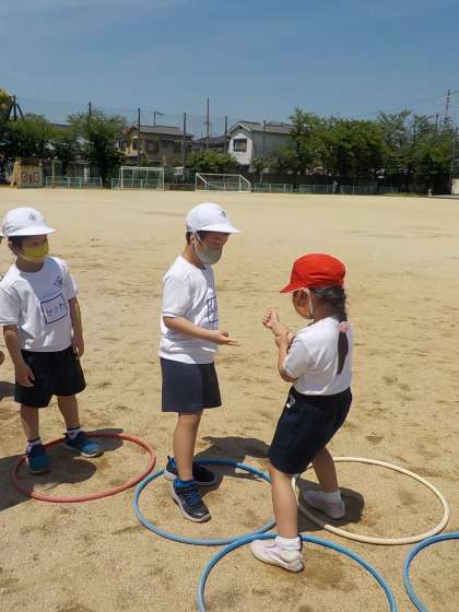 フープを使い,けんけんぱの練習をしました。足がからまるんじゃないかと思うほど早くけんけんぱをしていた子どもがいました。すごい!