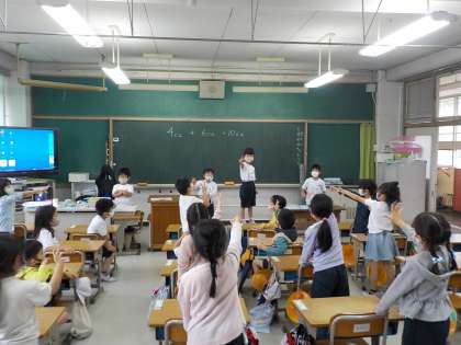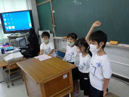 学級代表の4人を中心に,学校探検に連れて行ってくれた2年生へのお礼について考えています。1年生でも上手に司会をしていて,素晴らしかったです!代表で言葉を言う人を決めた後に,全員で練習もしました。