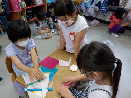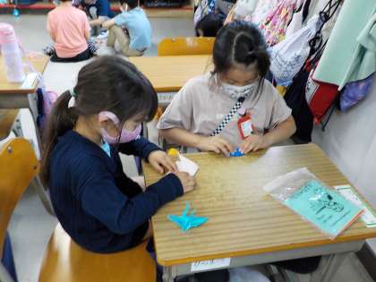 雨のため,休み時間は,教室で過ごしています。折り紙を楽しんでいる子どもたちです。
