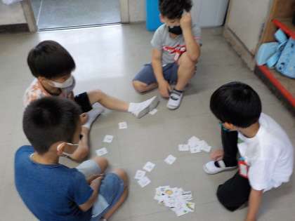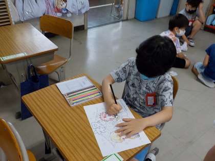 雨のため,休み時間は,教室で過ごしています。かるた・ぬりえを楽しんでいる子どもたちです。