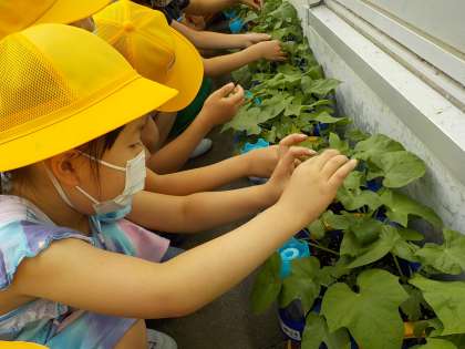 さわって観察している子たちが「毛が生えている!」「つるつるじゃなくなった」と感じたことを友だちと交流していました。
