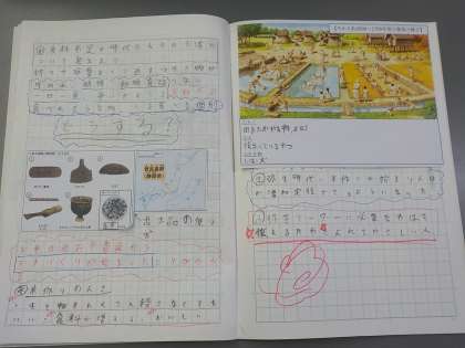 出土品から,どんな文化が生まれたのかを考え,この時代に発達した文化について考えることができました。ふりかえりに,「弥生時代のリーダーに必要な力は?」について,「頼れる人」「教えるのがうまい人」「指示できる人」「まとめることができる人」など必要なリーダー性について考えることができました。