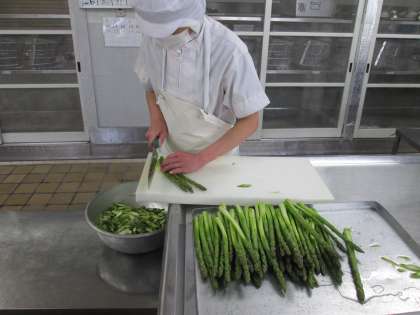 ウインナーとキャベツのソテーには,グリーンアスパラを使っています。5〜6月が旬のグリーンアスパラは,給食でもこの時期しか登場しません。