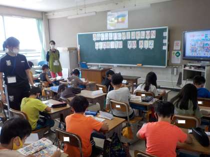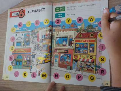 「アルファベットを探せ」です。町のイラストからA〜Zを探します。子どもたちからは「あった!」と嬉しそうに話していました。そこで先生から「あった!」って英語でどういうのだろうと話がありました。普段の何気ない一言から英語を使うことで,一層英語への親しみが生まれますね。