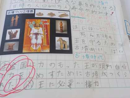 いつもふりかえりに「その時代に必要なリーダー」について考えます。古墳時代のリーダーに必要な力は「権力」「カリスマ性」「国を動かせる力」などと書かれていました。古墳の意味を理解して,古墳時代の人々の気持ちを考えることができました。