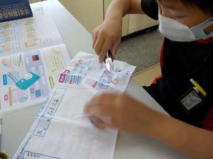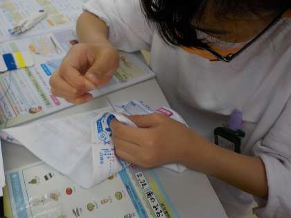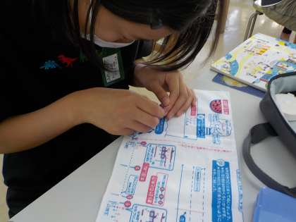 玉結び,玉止めを活用してボタンを布に止めています。ゆっくり丁寧に進めています。