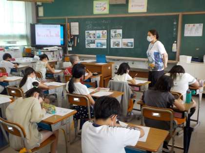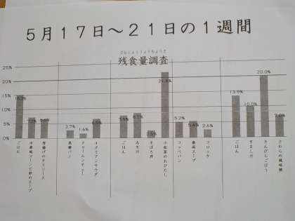 栄養教諭の先生が給食の時に出るゴミの処理について話をしてくださり,学習しました。実際の残食量調査のデータをもとに考えました。一番残食が少なかったメニューは「クリームシチュー」でした。「じゃあ,毎日クリームシチューにすれば食べ物がもったいなくないね」と先生が問うと「それはだめ」と子どもたちが発表し,栄養バランスや残さず食べることの大切さについて学ぶことができました。