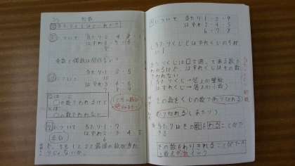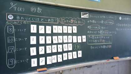 今日の算数は「約数と公約数」について学習しました。「その数に対しての当たりくじは?」という学習課題を進めていくうちに,当たりくじ(約数)がどれかだんだん分かってきたようです。