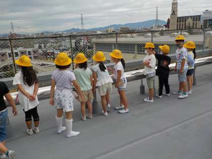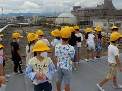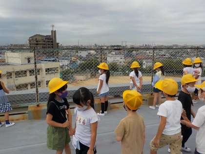「やくそく」の物語の中で,大げんかをしていた三匹の青虫が大きな木の上に登り,広い景色を見て仲直りするという場面があります。今日はみんなで屋上からの広い景色を見て,青虫たちの気持ちを考えました。