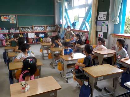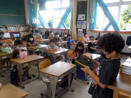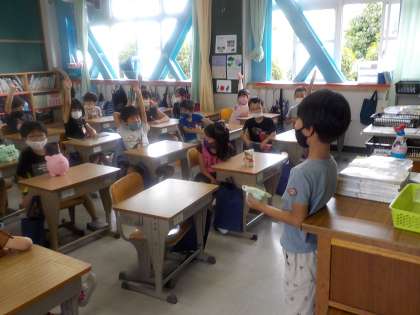 夏休みに作ってきてくれた貯金箱や理科展の作品などをみんなで鑑賞しました。作者からどんな風に作ったかの説明や,何でできているでしょうかクイズなどで盛り上がりました。どの作品も工夫がなされていて,すばらしかったです。