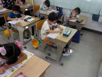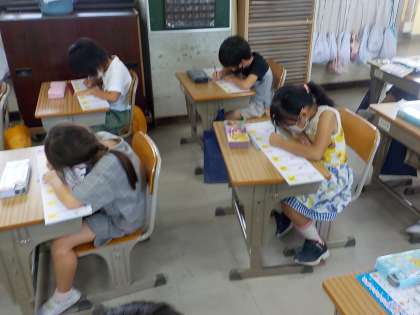 今日は,「男」「女」の2つの漢字を学習しました。画数が多い字は,書き順を何度も確認しながら書いていました。バランスよくなるよう,見本を見ながら,丁寧に書くことができました。
