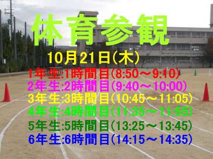 本日,10月21日(木)は体育参観です。各学年の参観できる時間をご確認ください。