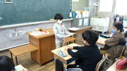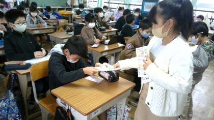 高学年になると,児童会のことを各クラスに伝えに行くということもあります。5年3組にいる児童会担当の児童から募金のお知らせがありました。