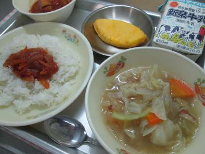 今日の献立は『ごはん・牛乳・米粉マカロニスープ・セルフチキンライス・オムレツ』でした。「セルフチキンライス」は,ごはんと混ぜて,自分でチキンライスにして食べます。