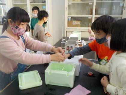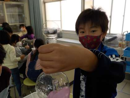 ガラス管のなかにあるゼリーの動きを観察して,空気が温度によって体積が変化することを理解しました。油断するとガラス管から勢いよくゼリーが飛び出してしまいます。お湯と氷水に交互にフラスコをつけて,ゼリーの動きを楽しんでいました。