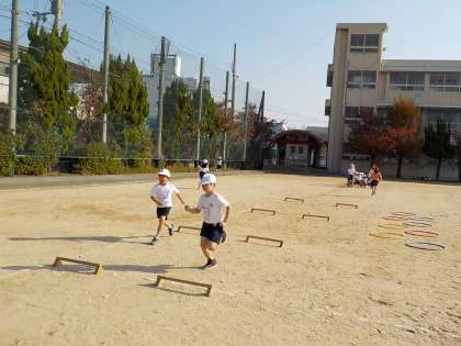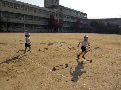 ハードル走につながる運動をしています。今日は,小さなハードルを走ってとび越える練習をしました。
