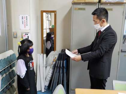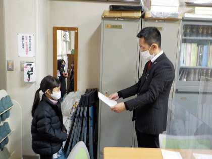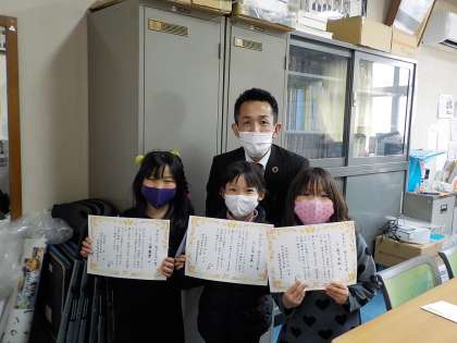 なわとびチャレンジカードの項目を全てクリアできたので,校長先生から表彰してもらいました。休み時間や休校期間中にもたくさん頑張ったようです。これからもいろいろなことに挑戦してください!