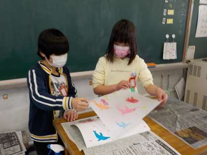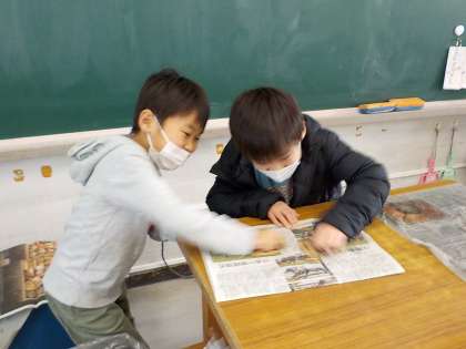 版画の続きです。今日は,いよいよ刷る工程でした。2人で協力し,色がきれいにつきますように!と思いを込めて刷りました。