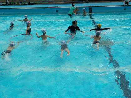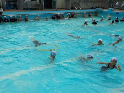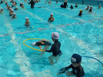 最後は,フラフープにつかまり,友だちに引っ張ってもらいました。