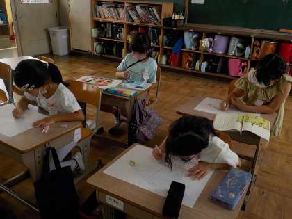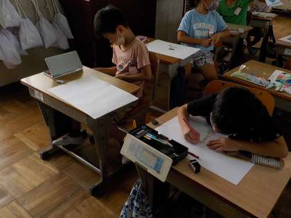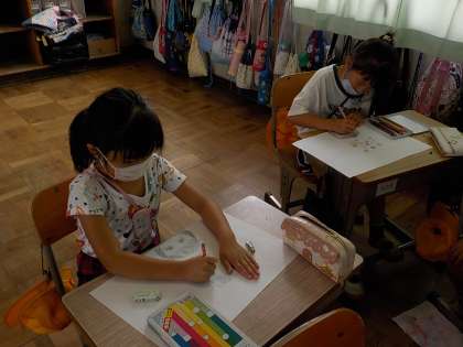 「ミリーのすてきなぼうし」のような,自分が想像した自分のぼうしを絵で描きました。自分の好きなものを描いていたり,キャラクターを描いていたり,楽しいぼうしがたくさんありました。