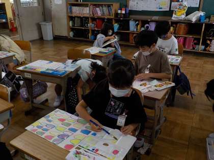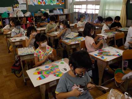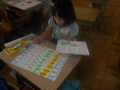 「にじいろのさかな」の続きです。足らなくなったうろこをつぎ足し作ったり,丁寧に一枚一枚うろこを貼ったり,周りで泳ぐ海の生き物を描いたりと,作品が少しずつ完成へと近づいています。どんな作品ができるか楽しみです。