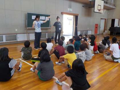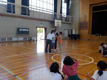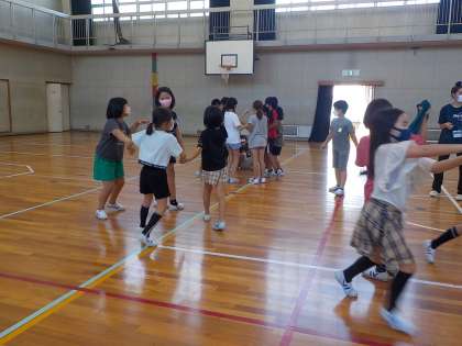 今日は,教室ではなく体育館で体を動かしながらの外国語です。
